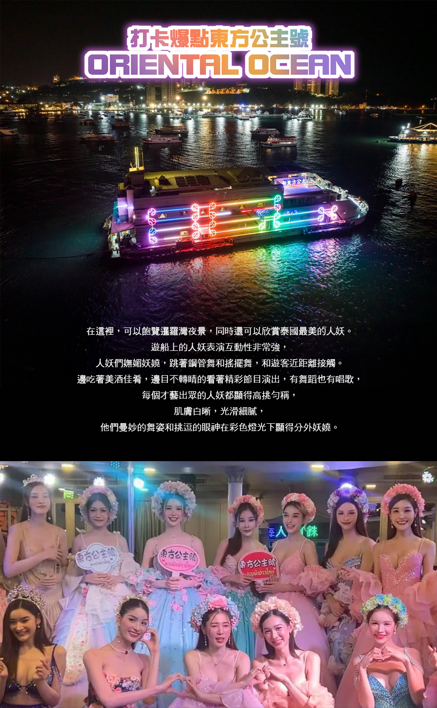 【東方公主號-ORIENTAL OCEAN】在這裡,可以飽覽暹羅灣夜景,同時還可以欣賞泰國最美的人妖。遊船上的人妖表演互動性非常強,人妖們嫵媚妖嬈,跳著鋼管舞和搖擺舞,和遊客近距離接觸。邊吃著美酒佳肴,邊目不轉睛的看著精彩節目演出,有舞蹈也有唱歌,每個才藝出眾的人妖都顯得高挑勻稱,肌膚白晰,光滑細膩,他們曼妙的舞姿和挑逗的眼神在彩色燈光下顯得分外妖嬈。